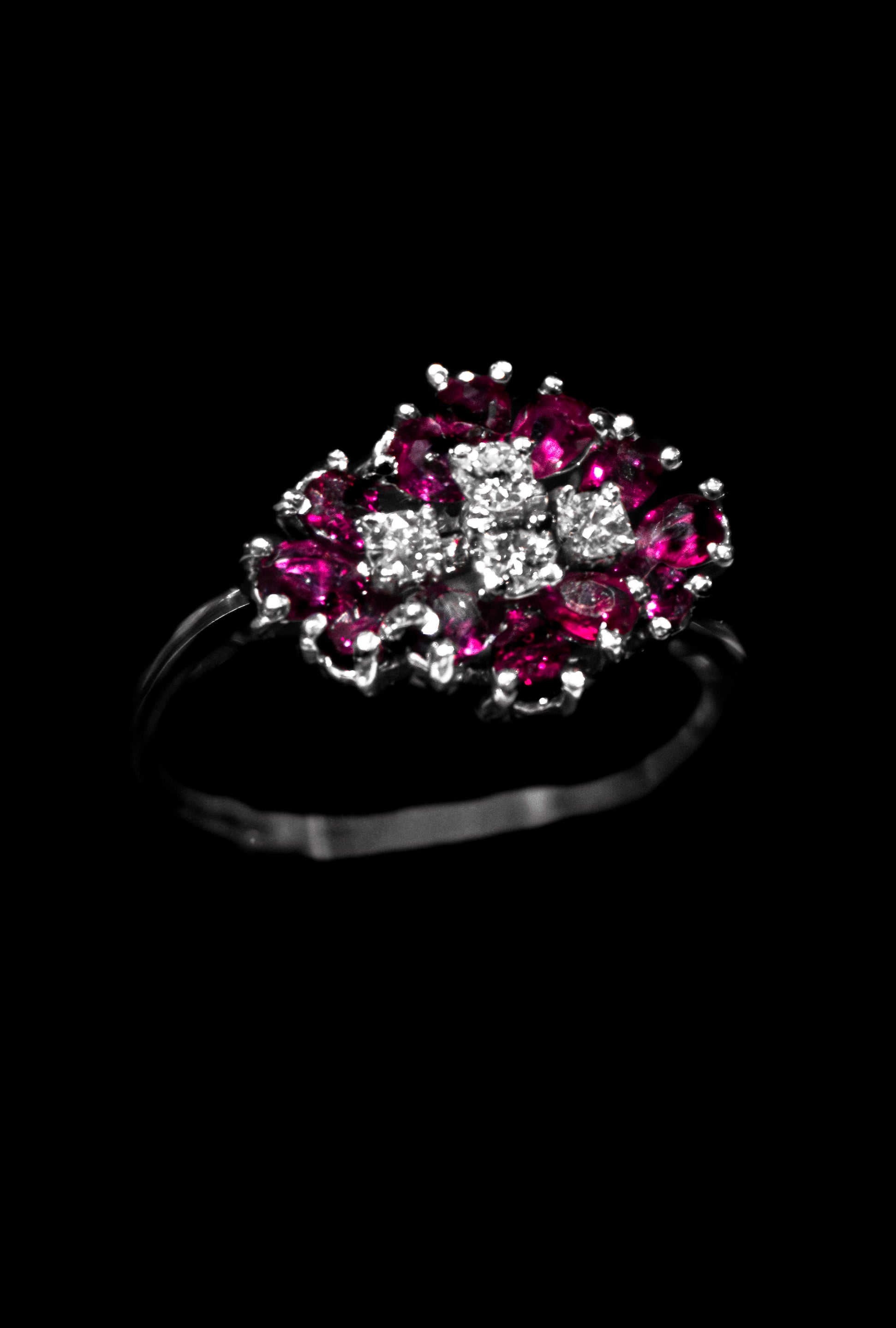 Anello in oro bianco 18k.ti con veri diamanti taglio brillante carati 0.40 e veri rubini taglio tondo e marquise carati 1.10. Il gioiello è stato realizzato artigianalmente con cura e passione ed è perfetto per chi vuole indossare il classico ma con un pizzico di modernita'.