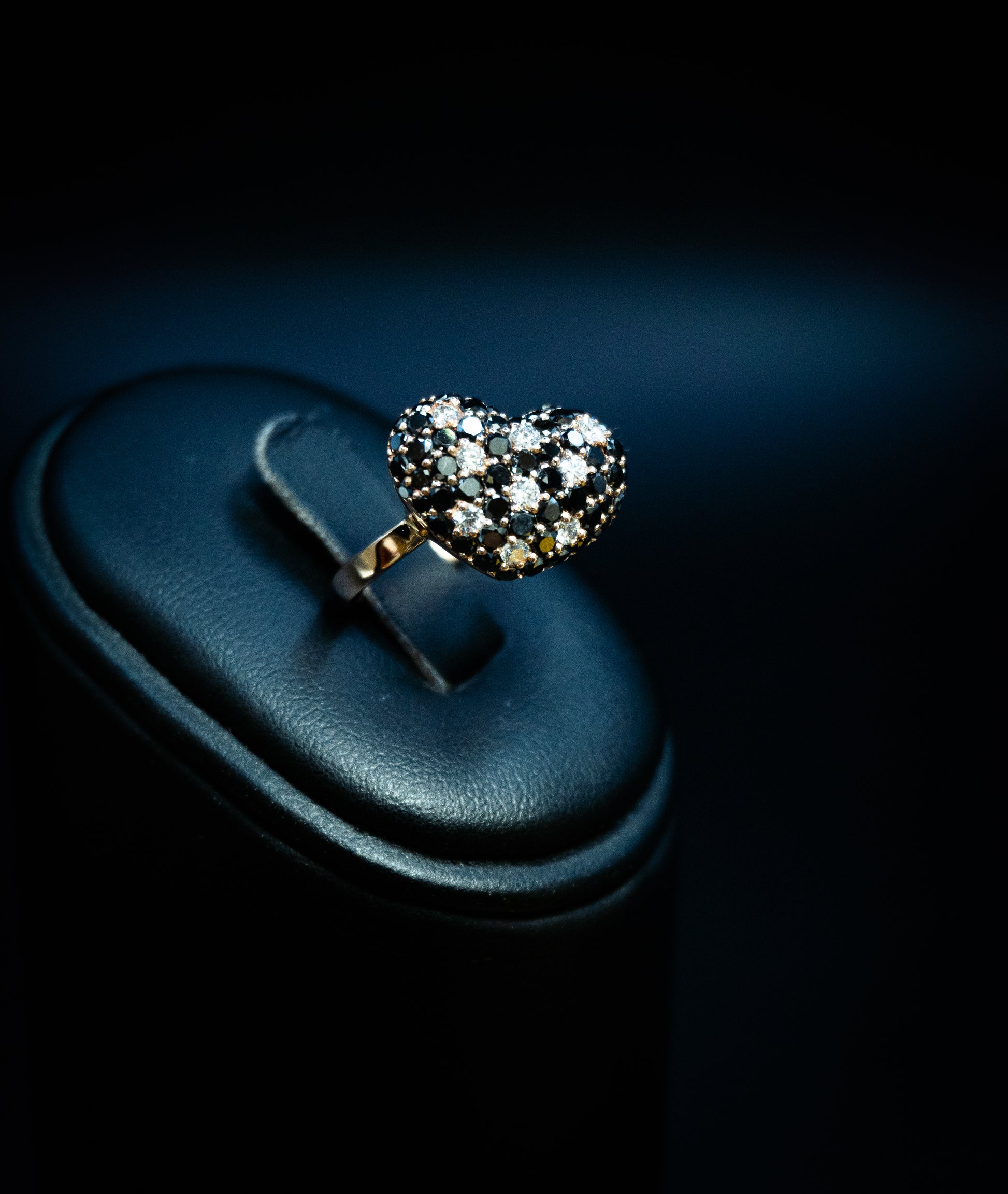 Anello cuore bombato in oro 18 k. ti con Diamanti taglio brillante bianchi carati 0.32 e neri carati 1.55