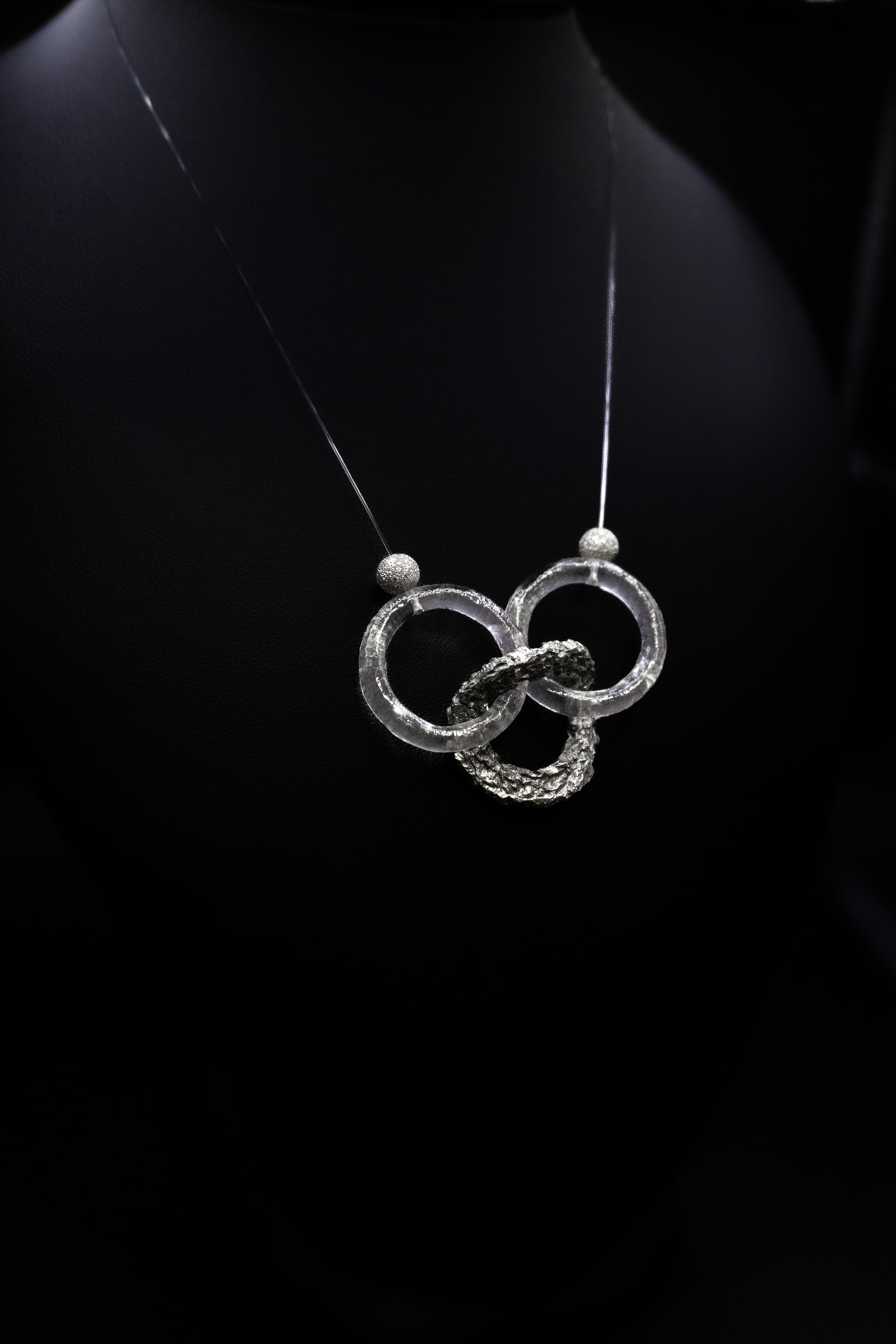 Collana Artigianale in Argento "Linea Frammenti di Luna" creata con un centrale formato da un intreccio di anelli in argento pieno e resina. La collana in nylon invisibile per valorizzare il centrale come fosse sospeso.