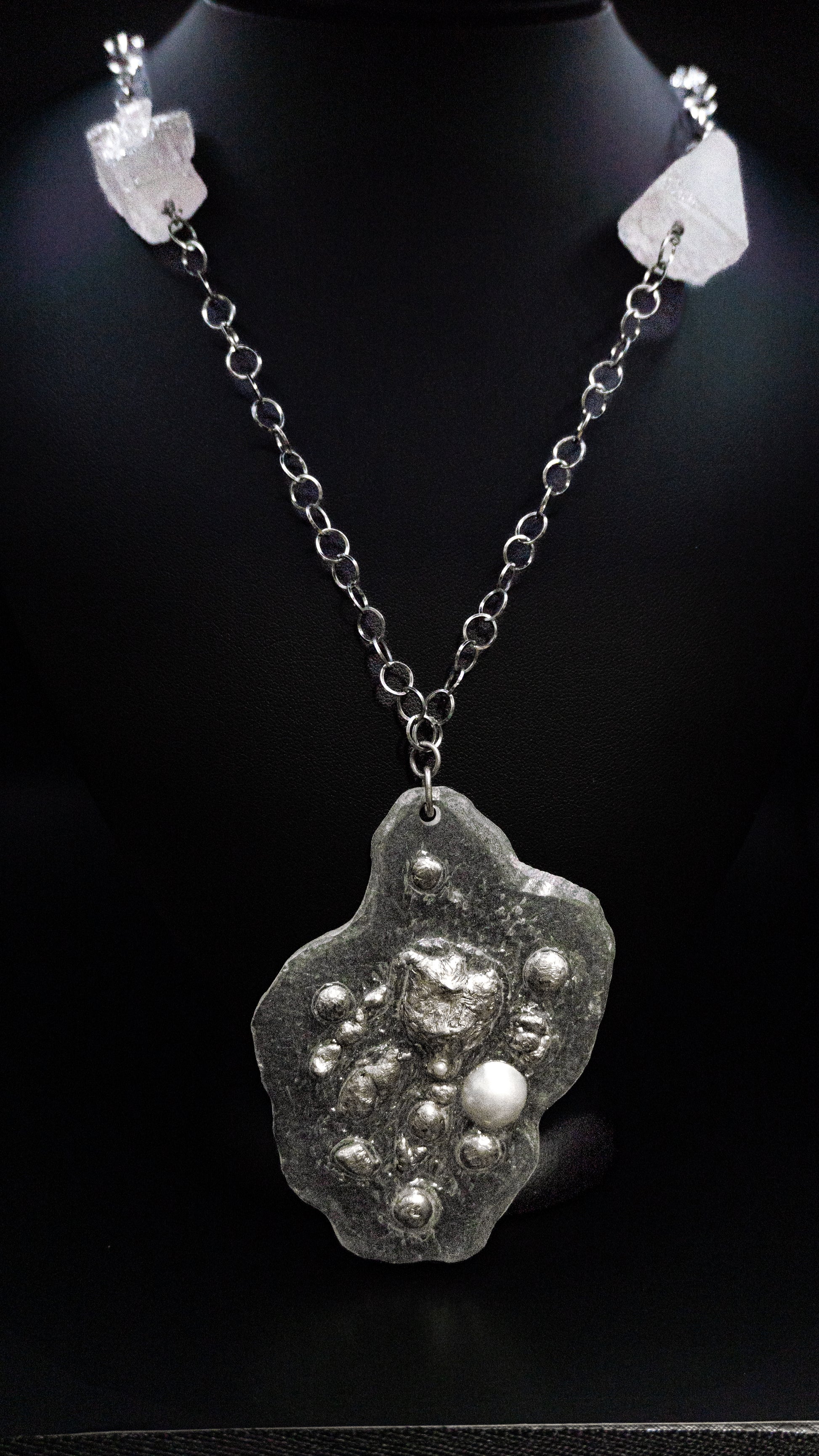 Collana linea Klondike formata da anelli in alluminio leggerissima intervallata da quarzo rosa naturale e la sua lunghezza è di circa 80 cm. A completare il gioiello un meraviglioso ciondolo di corca 8 cm lavorato interamente a mano con resina , Argento e una vera Madre perla di circa 10 mm. Una collana dallo stile moderno e unico nel suo genere.