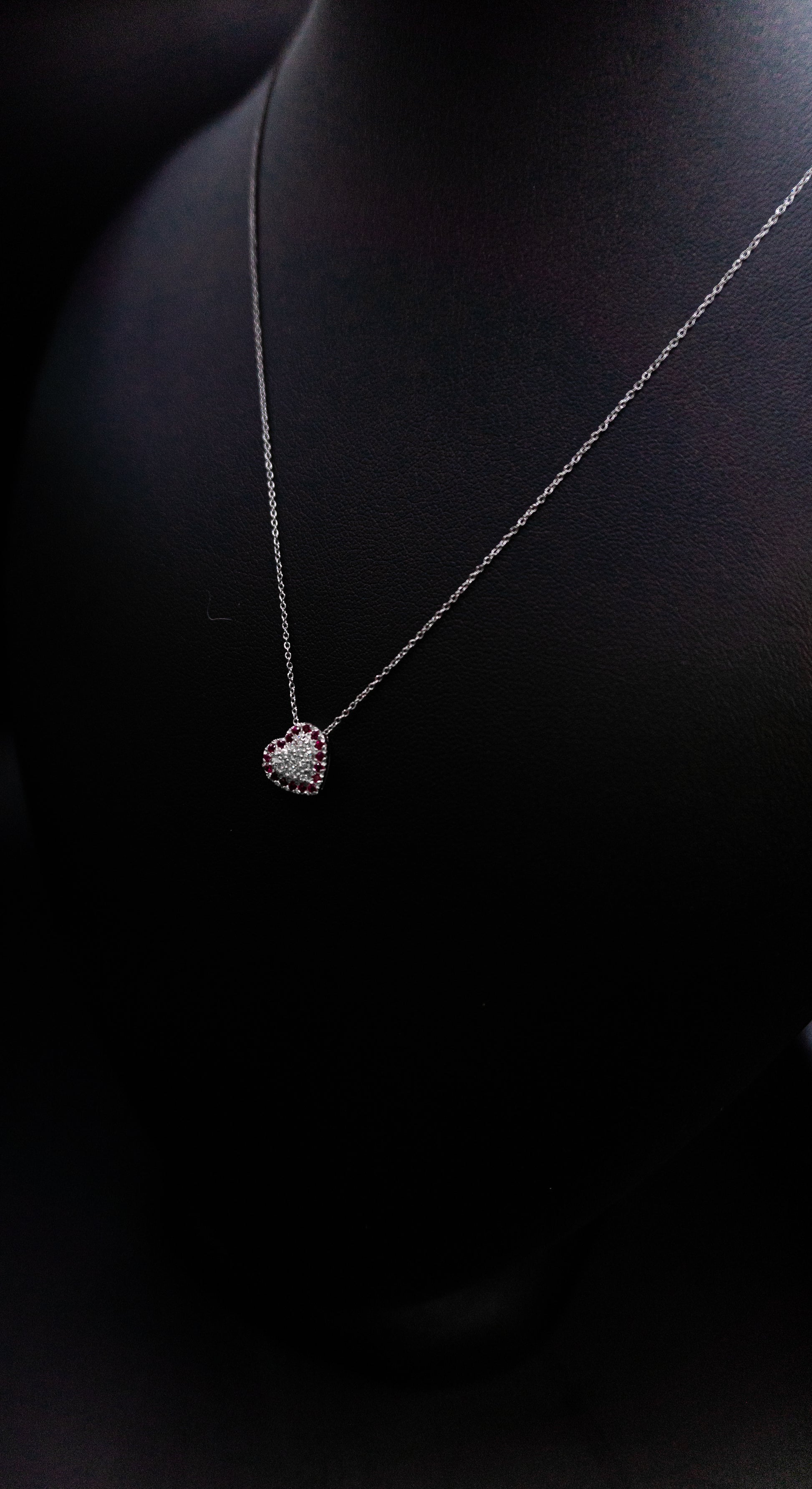 Collana e ciondolo cuore in oro 18 k. ti con Diamanti taglio brillante carati 0.11 e Rubini carati 0.21.