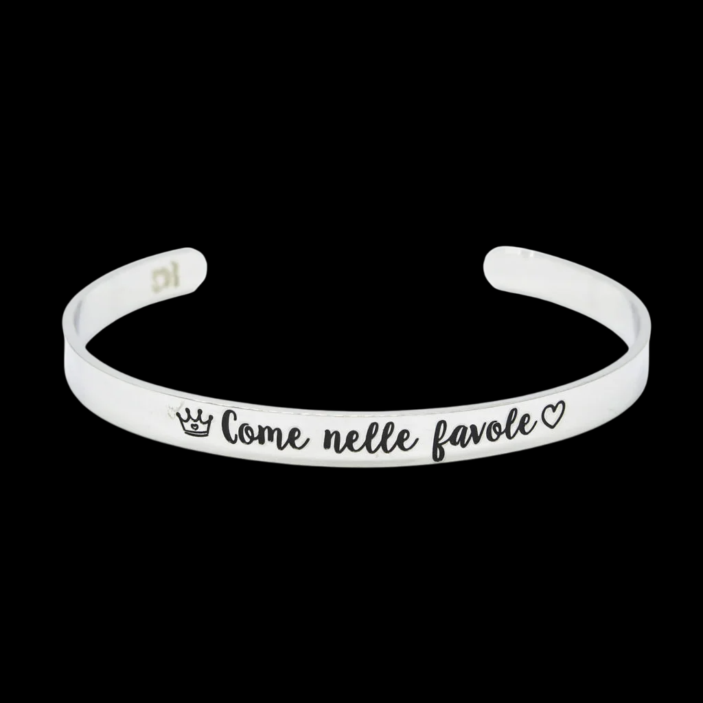 Bracciale rigido in acciaio regolabile con incisa la frase “Come nelle favole” arricchito da un piccolo cuore e una corona smaltati.