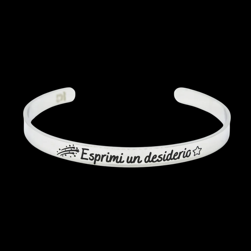 Bracciale rigido in acciaio regolabile con incisa la frase “Esprimi un desiderio” e una piccola stella cadente smaltata.