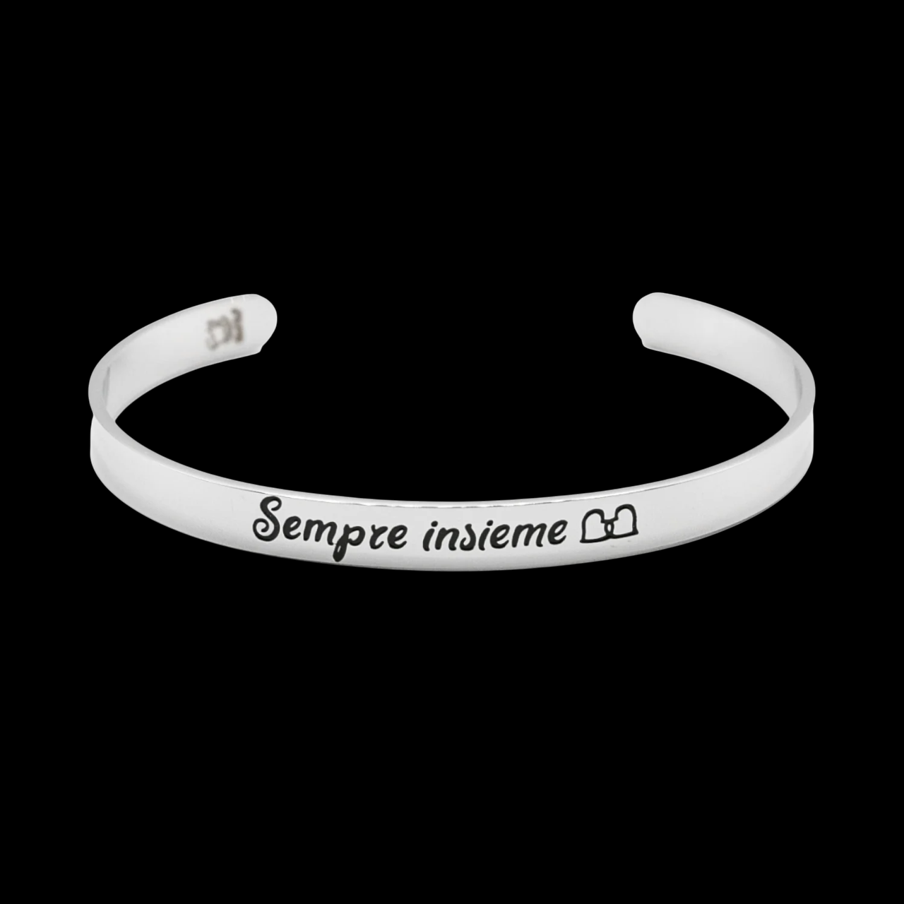 Bracciale rigido in acciaio con incisa la frase “Sempre insieme” e due piccoli cuori che si incontrano, simbolo di vera amicizia.