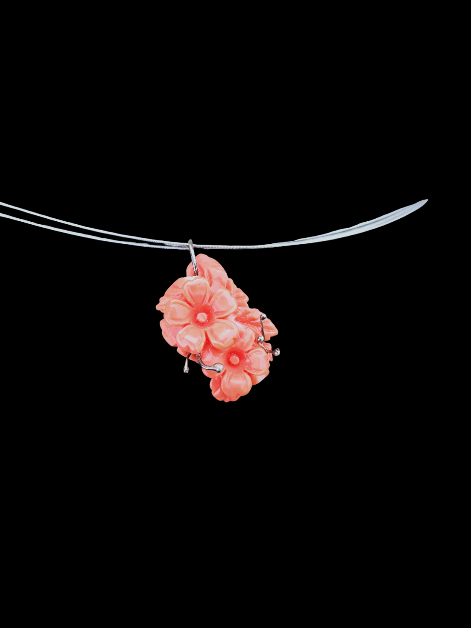 Fantastico ciondolo in corallo lavorato artigianalmente di qualita' elevata. I fiori sono intagliati con maestria ed eleganza. Il tutto è stato completato con argento 925 . La grandezza è di cm2.5x1.8. Gioiello adatto per chi ama indossare gioielli unici e artigianali.