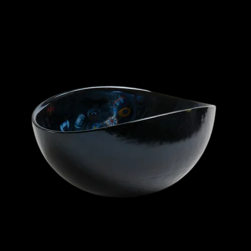 Il piatto originale in vetro di Murano viene lavorato in speciali dischi rotanti e poi rifinito dal nostro maestro vetraio nella sua forma unica.