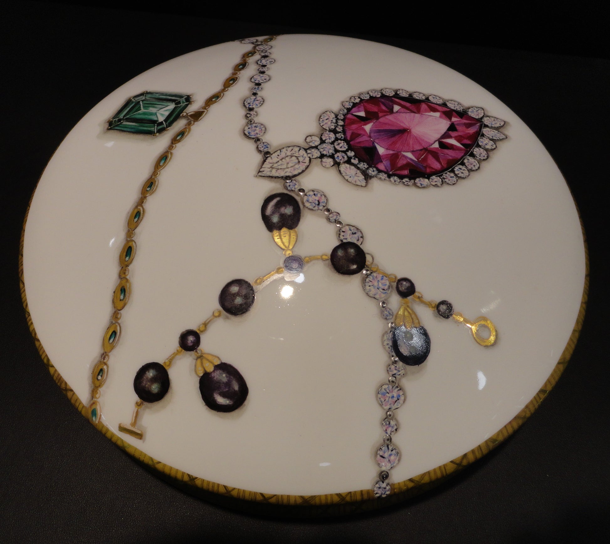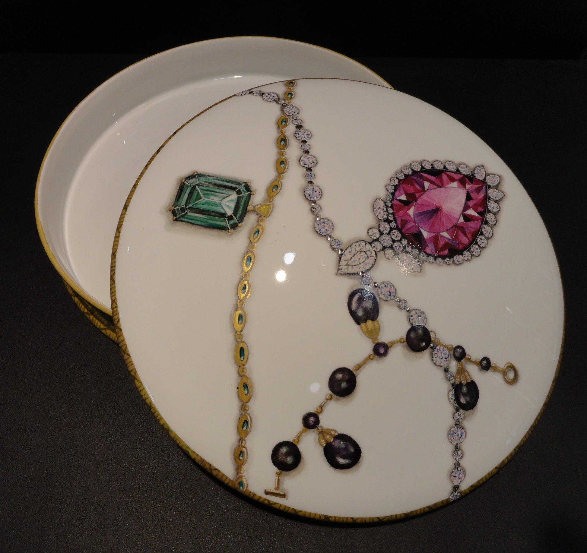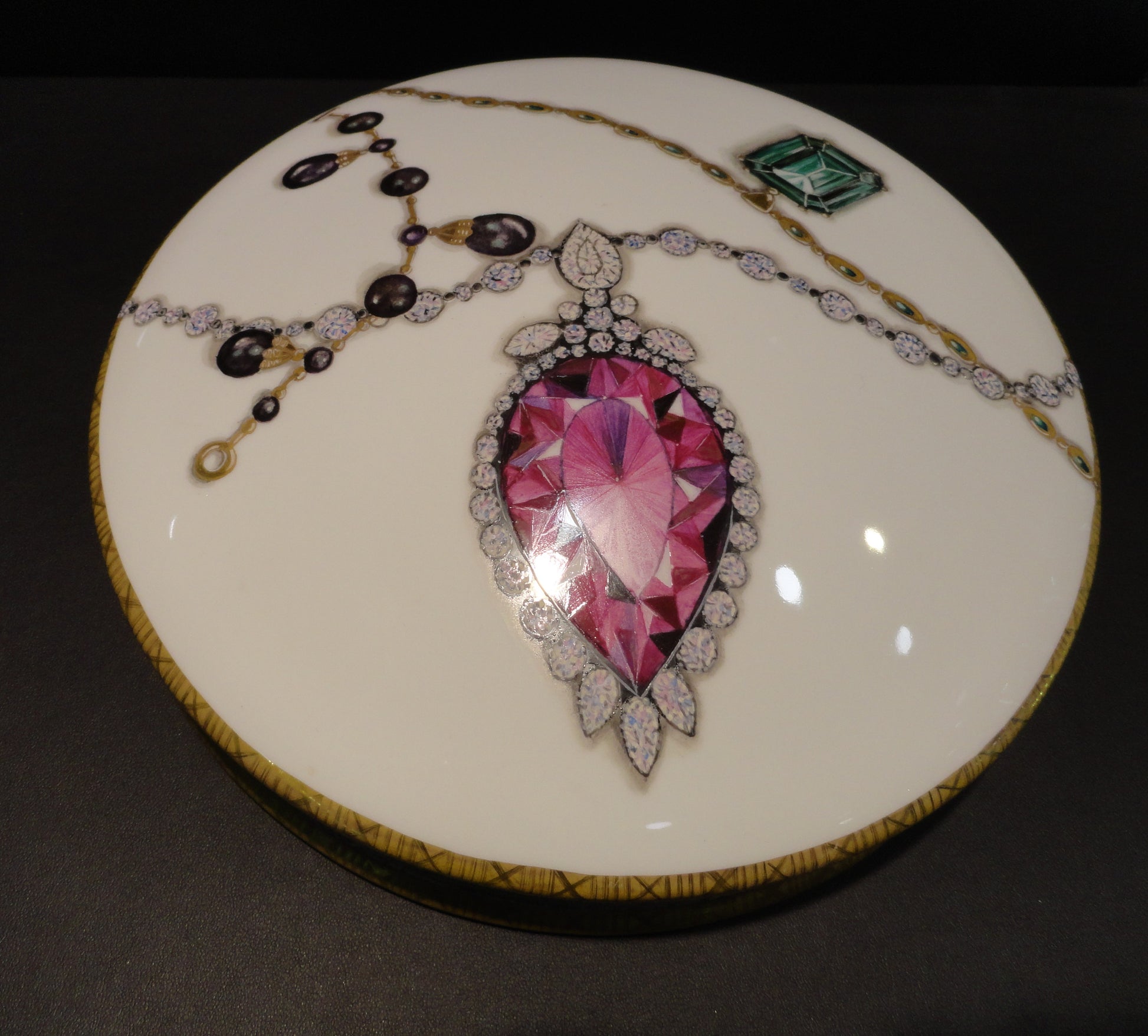 Questo cofanetto chiamato dall'artigiano "Pietre Preziose" è in pregiata porcellana. Un oggetto unico dipinto interamente a mano dall'artista che ha voluto esprimere con effetto realistico le pietre preziose utilizzando la tecnica del terzo fuoco. La base del cofanetto è dipinta con lustro nero effetto marmorizzato e il tutto è impreziosito con oro zecchino inciso con una punta d'agata. la decorazione ha richiesto piu' fasi lavorative con quattro cotture a 780°. Altezza 8cm circa e diametro circa 24 cm
