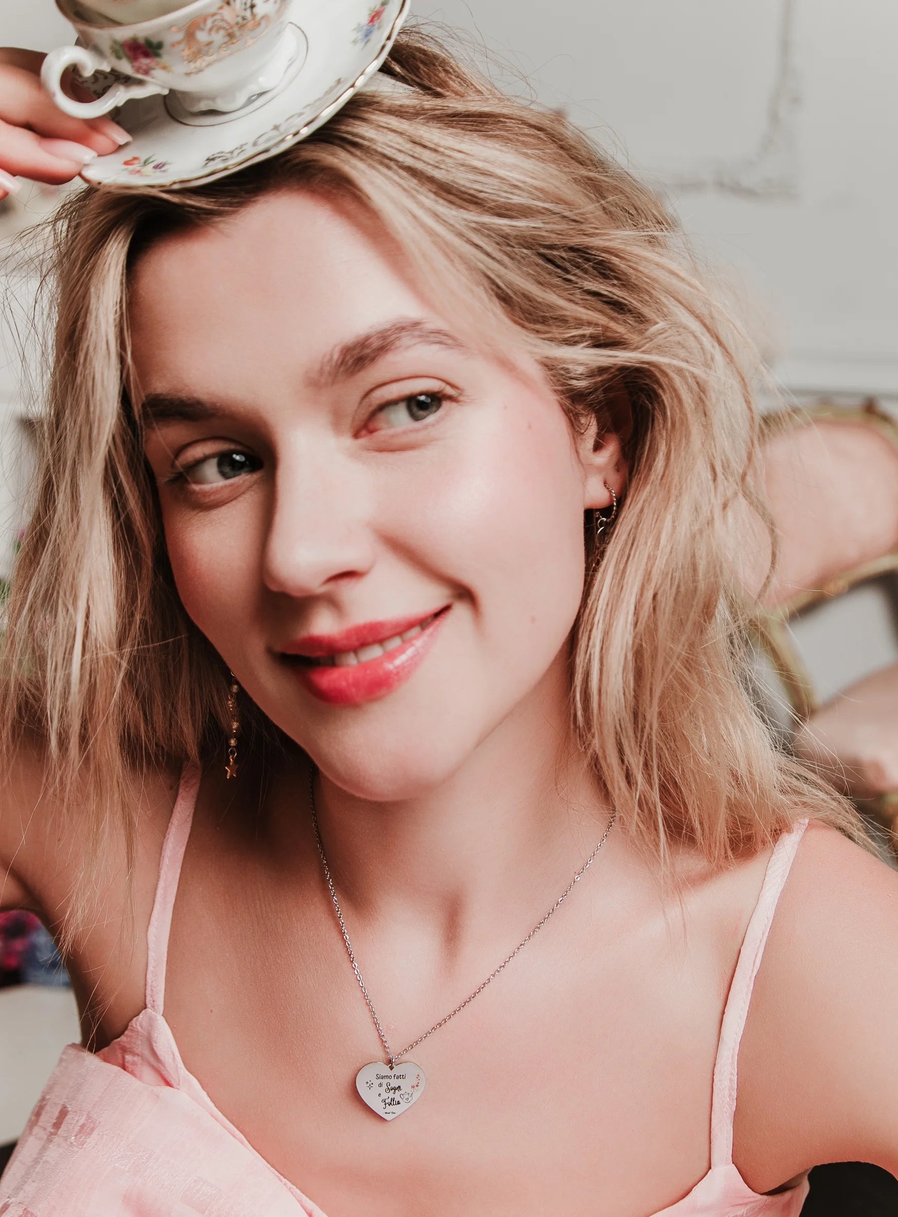 Collana con ciondolo a forma di cuore con incisa la frase “Siamo fatti di Sogni e Follia” e una piccola teiera che versa un tè fatto di fiori e stelle.