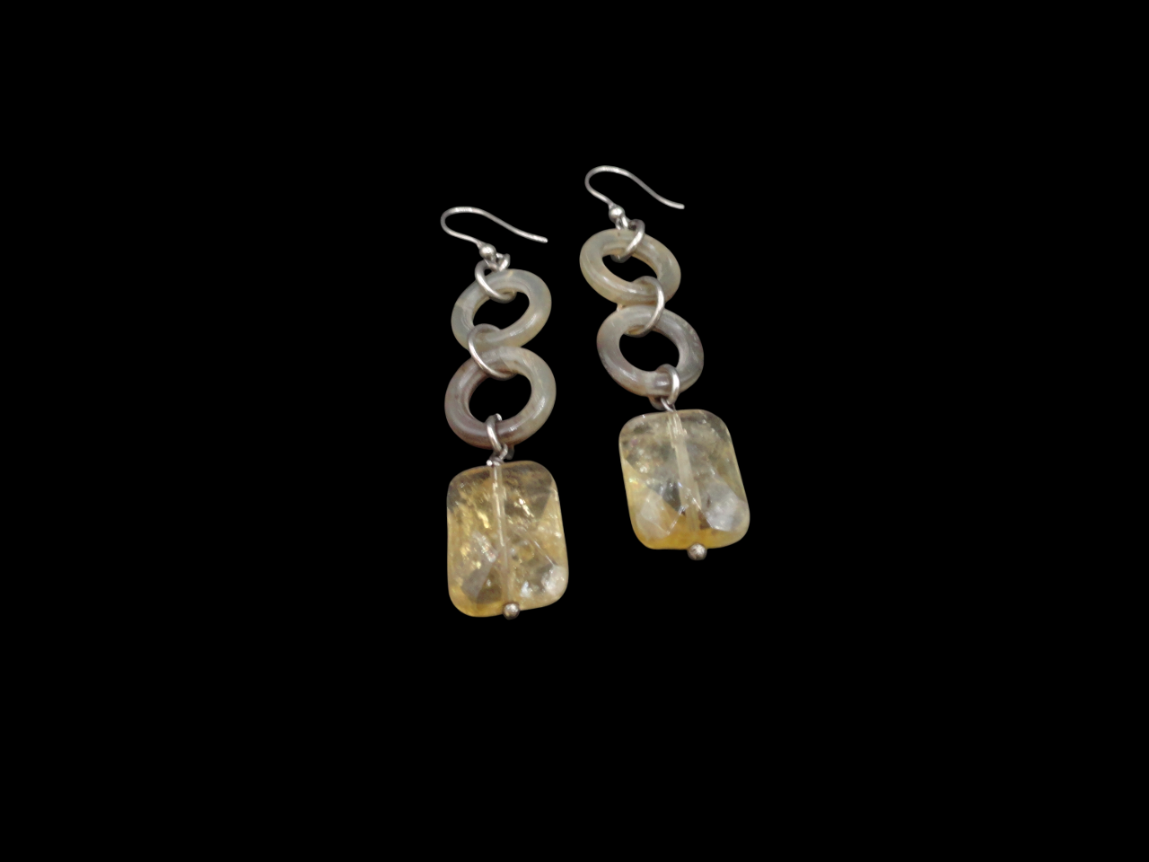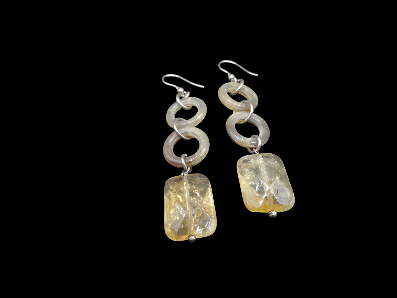 Orecchini in argento 925 con dischetti di vero corno e al fondo rettangoli di topazi citrini. Lunghezza orecchini cm 8