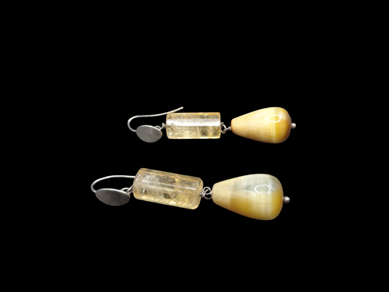 Orecchini argento 925 con goccia di occhio di tigre e topazio citrino di forma tubolare. Lunghezza orecchini cm6.5