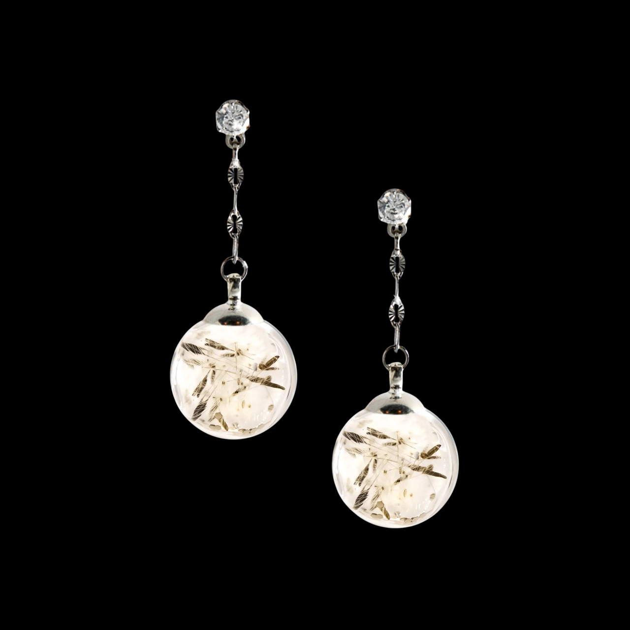 Orecchini con piccole sfere in vetro antiurto contenenti piccoli glitters dorati e veri semi di soffione essiccati e stabilizzati. Montatura con catena diamantata in acciaio e cristallo a lobo.
