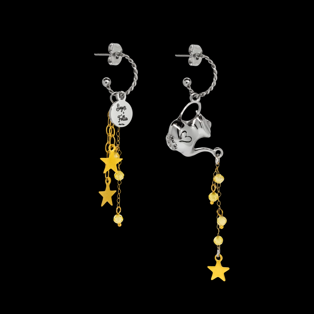 Orecchini asimmetrici con teiera che versa un tè di cristalli dorati e piccola stellina finale pendente da una parte e pioggia di piccoli cristalli, stelle e una piccola targhetta con incisa la frase “Sogni e Follia” dall’altra. Montatura con anello in acciaio.