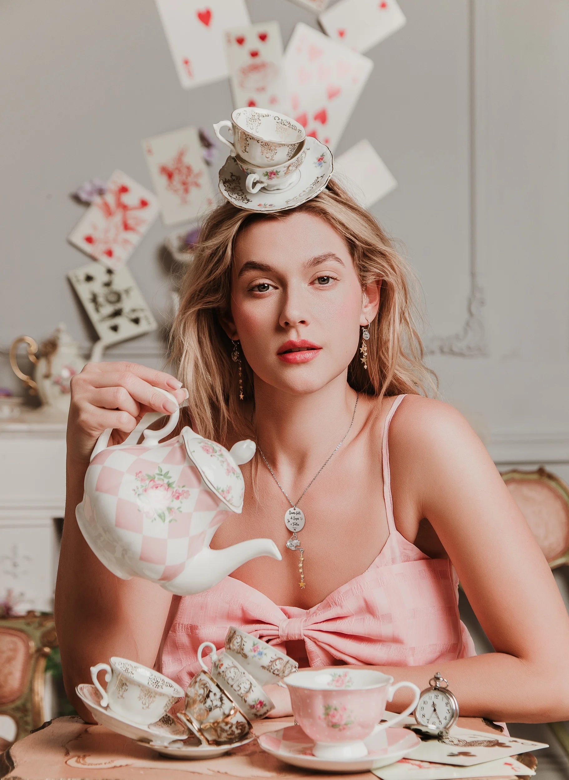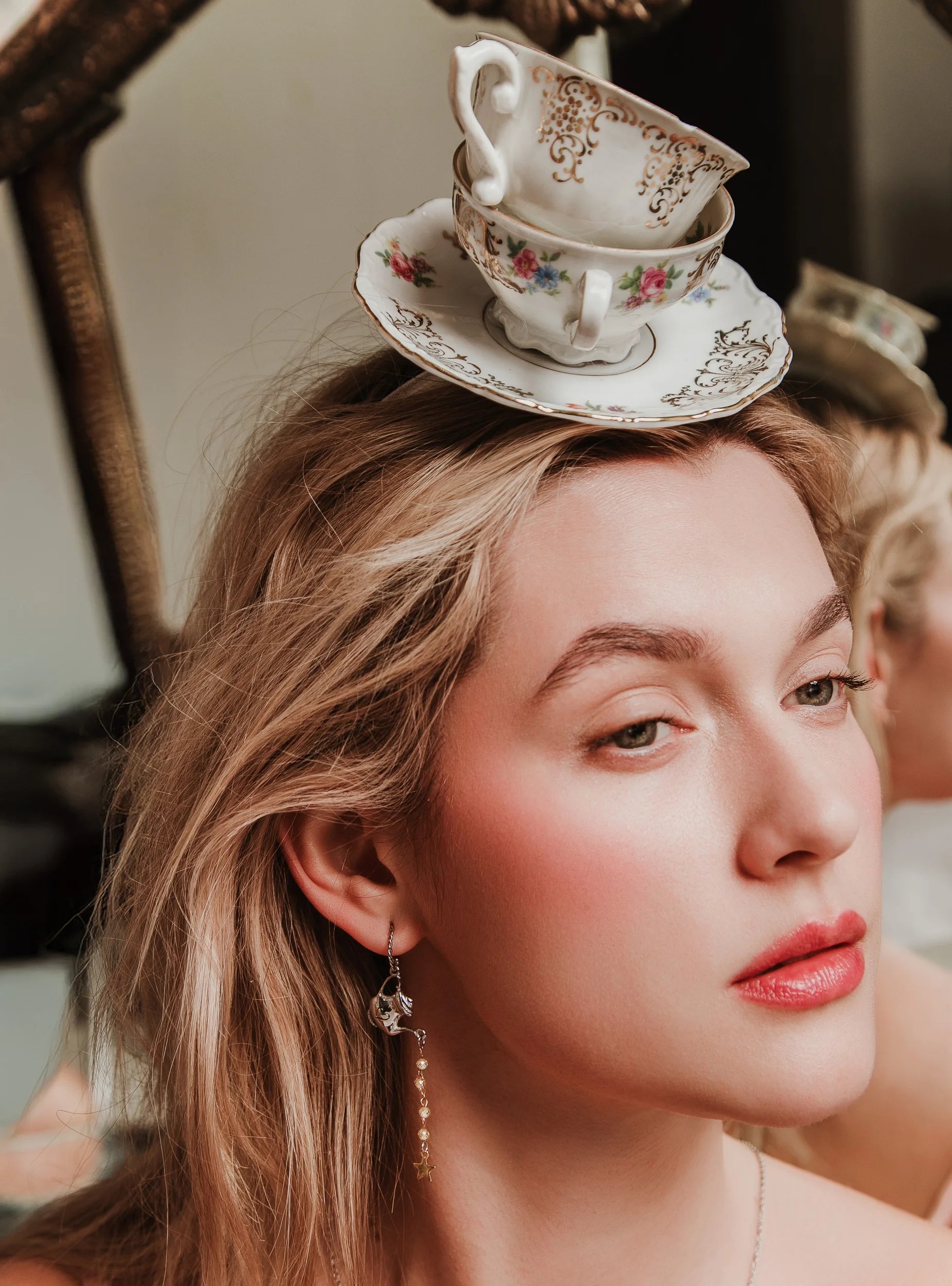I sogni ci guidano oltre l’ordinario mentre la follia ci libera dalle regole ed è così che una teiera capovolta versa una pioggia di cristalli luccicanti, come un brindisi eterno al tè più stravagante di sempre. Questi orecchini sono un invito a perdersi, a sognare, a credere che l’impossibile sia solo una questione di prospettiva.
