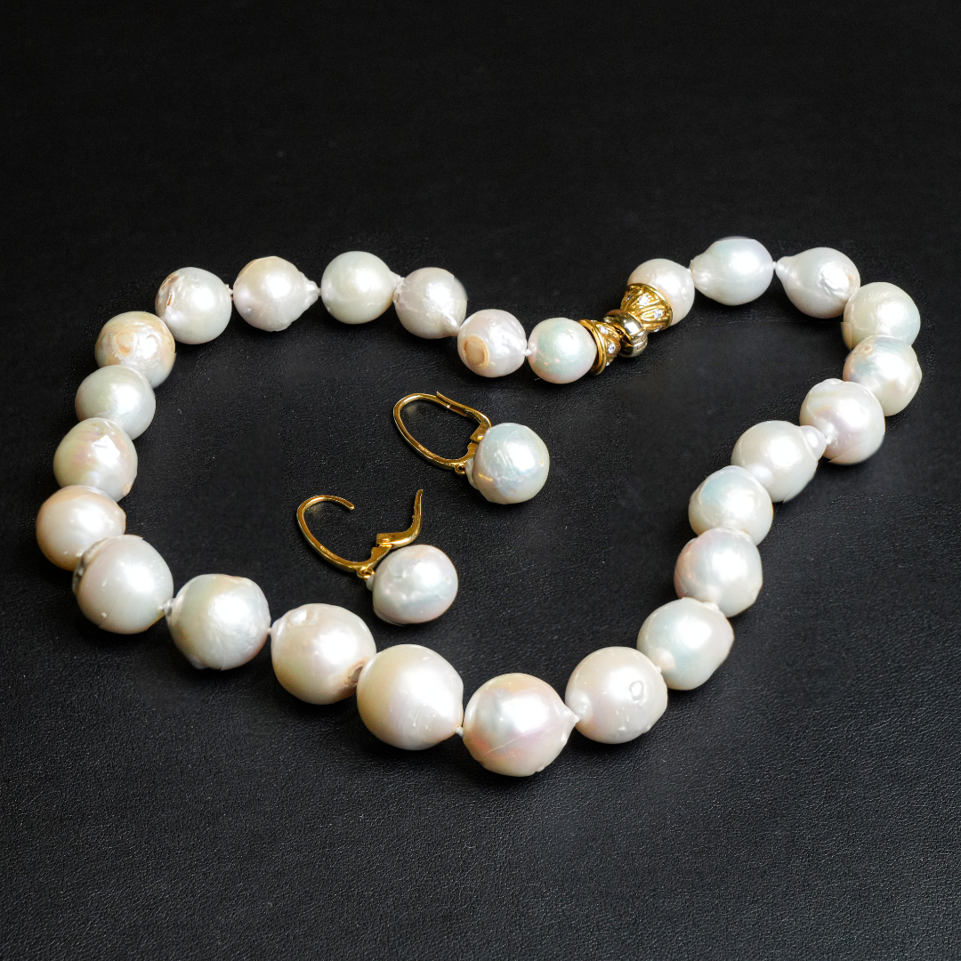 Collana di perle vere scalari da 12 mm a 18 mm impreziosite da una chiusura in oro 18 k. ti in coordinato con orecchini di perle da 16 mm con chiusura in oro 18k .ti. Gioielli unici che combinati conferiscono un eleganza senza tempo e donano stile e classicità senza tempo.