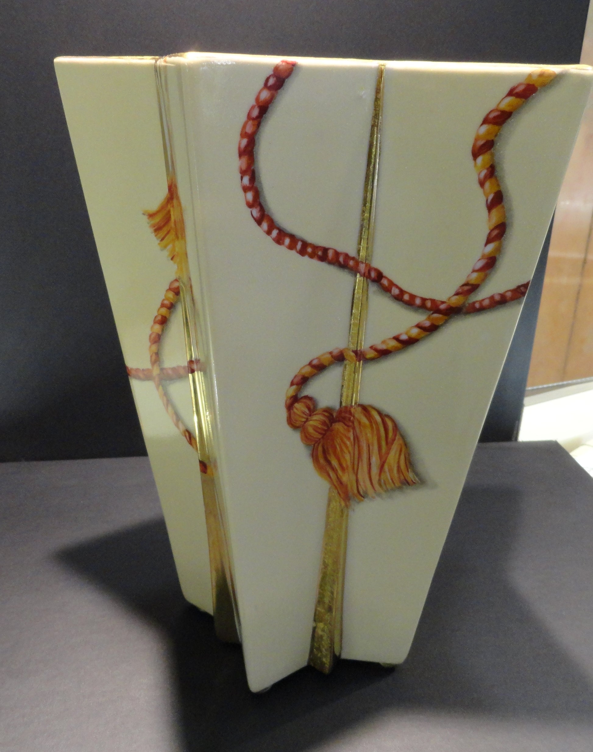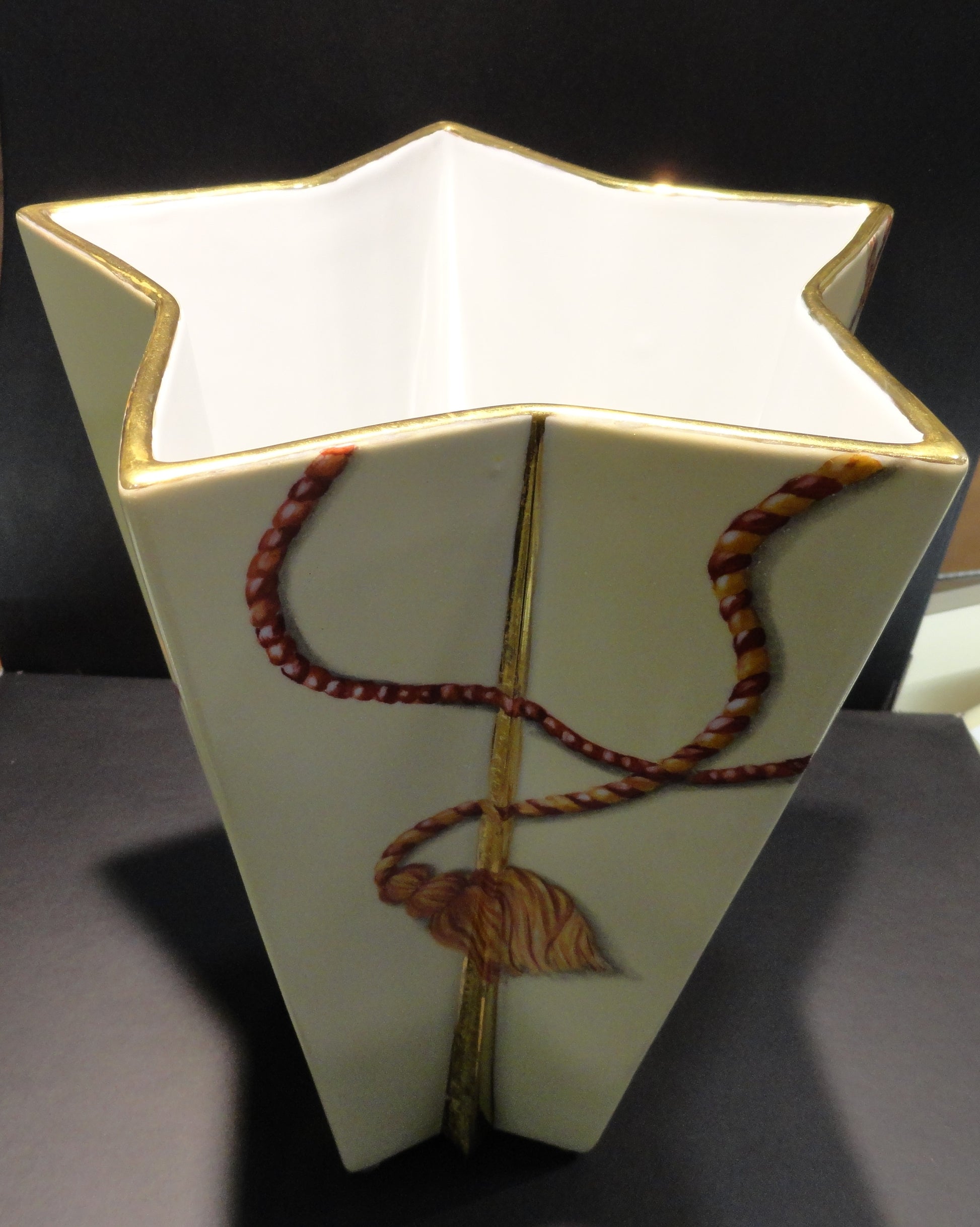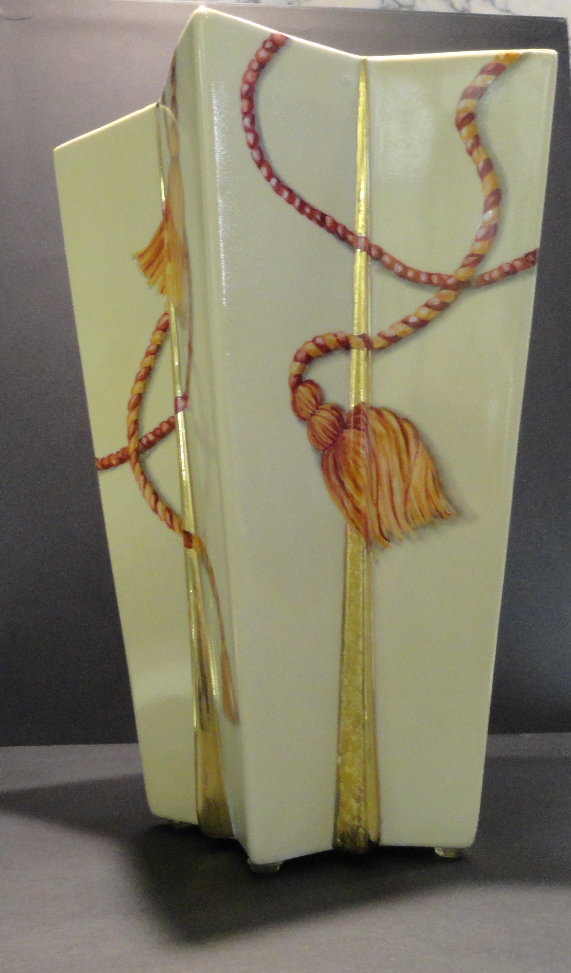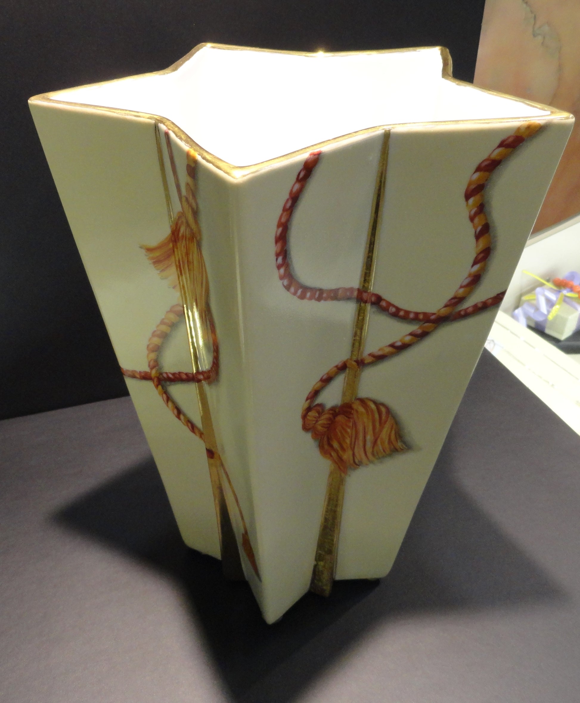 Vaso in Porcellana Unico dipinto interamente a mano, utilizzando pigmenti colorati per la tecnica del terzo fuoco. Le "nappine" sono realizzate con diverse tonalita' di rosso e il fondo è avorio. Il tutto impreziosito con oro brillante che in alcune parti è stato lavorato con un effetto "cristalli di ghiaccio". La decorazione ha richiesto piu' fasi lavorative con 3 cotture a 780° Il vaso presenta un altezza di circa 30 cm e un diametro di circa 20 cm.
